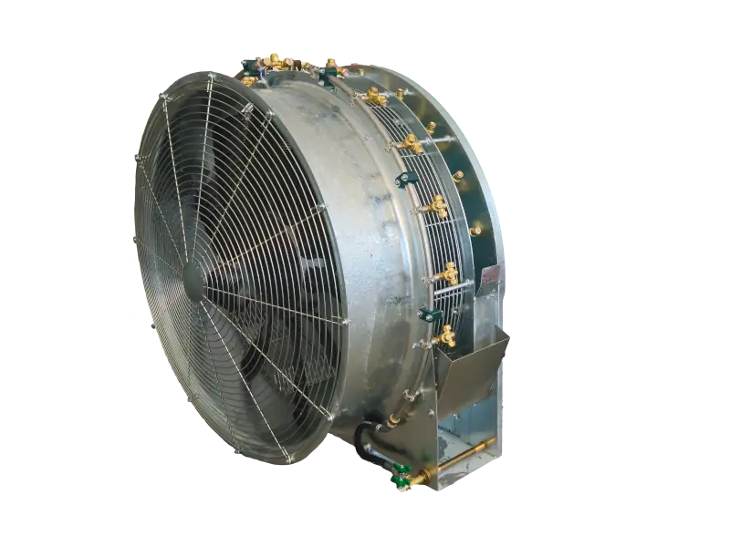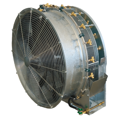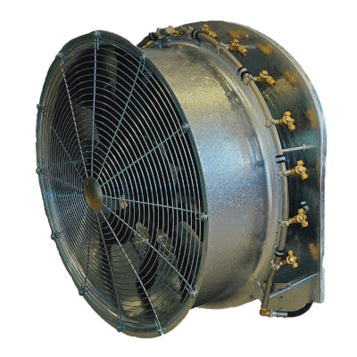 Moltiplicatore ad ingranaggi, Convogliatore con ventola zincato, Elica brevettata, Aste porta getti in acciaio inox, Rete di protezione interna ed esterna, Cono aria per una migliore distribuzione, Raddrizzatore d’aria, Senza getti.