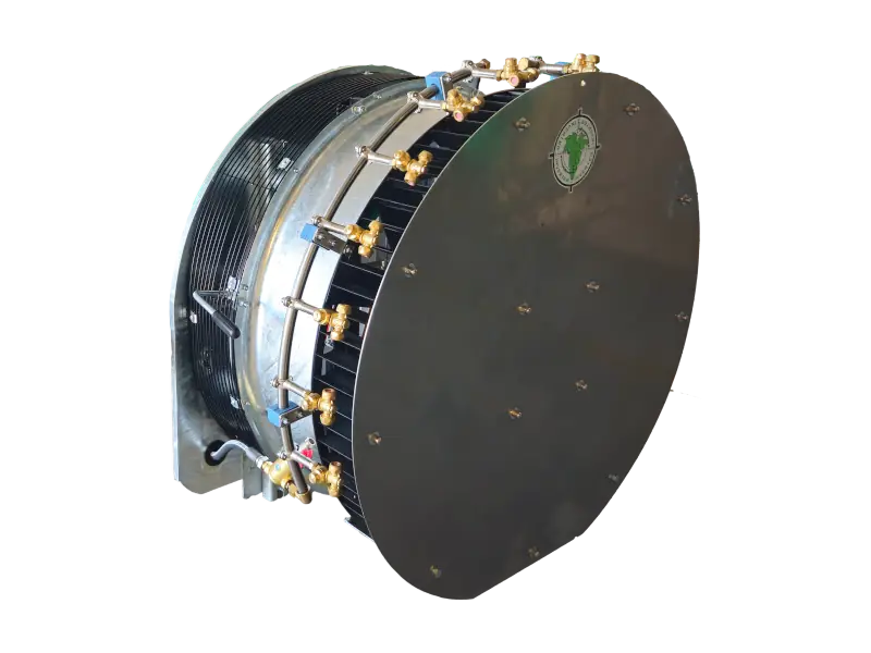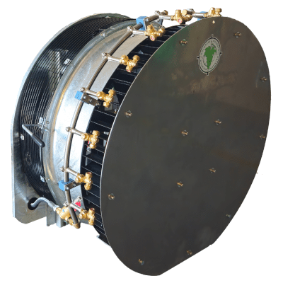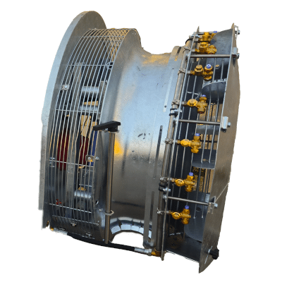 Moltiplicatore ad ingranaggi, Convogliatore con ventola zincato, Elica brevettata, Aste porta getti in acciaio inox, Rete di protezione interna ed esterna, Cono aria per una migliore distribuzione, Senza getti, senza raddrizzatore.