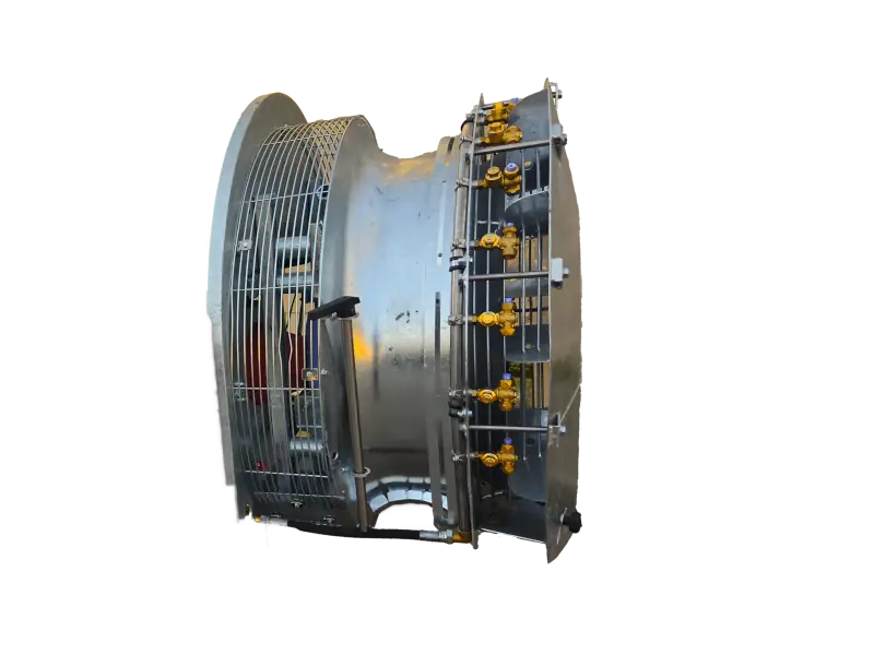 Moltiplicatore ad ingranaggi, Convogliatore con ventola zincato a doppio diffusore, Elica a passo variabile, Aste porta getti in acciaio inox, doppia paratia per recupero aria inferiore e alette regolabili, predisposizione per 24 getti, alette inferiore con prolunga estraibile.